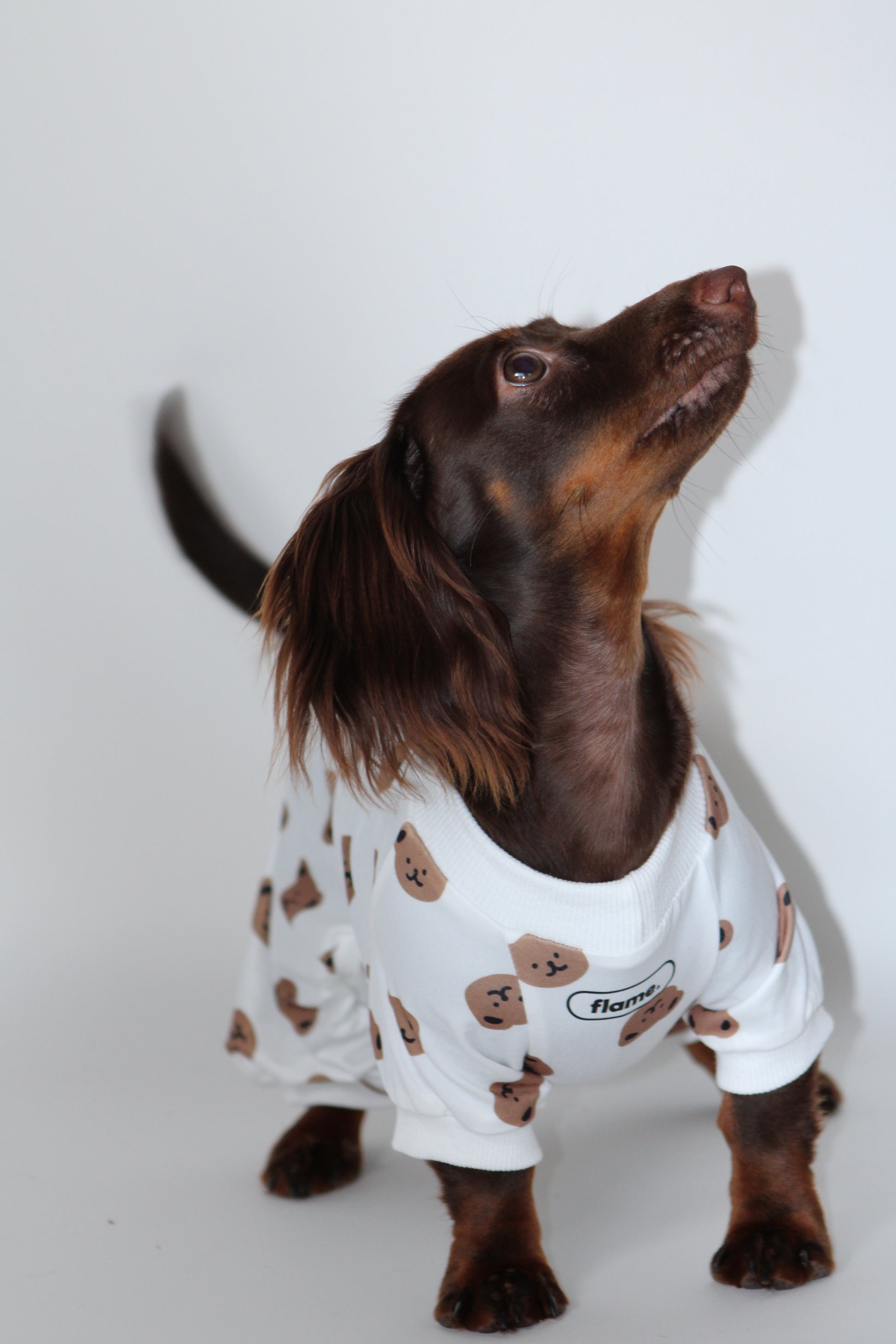 Upgrade your pup's nap time with our Cozy Teddy Bear Pajamas. This full-body onesie is designed for ultimate comfort, keeping your furry friend warm and snuggly through the night (or during those long Sunday afternoon naps). Featuring an all-over print of friendly little bear faces on a crisp white background, it’s the perfect combination of "cute" and "comfy."